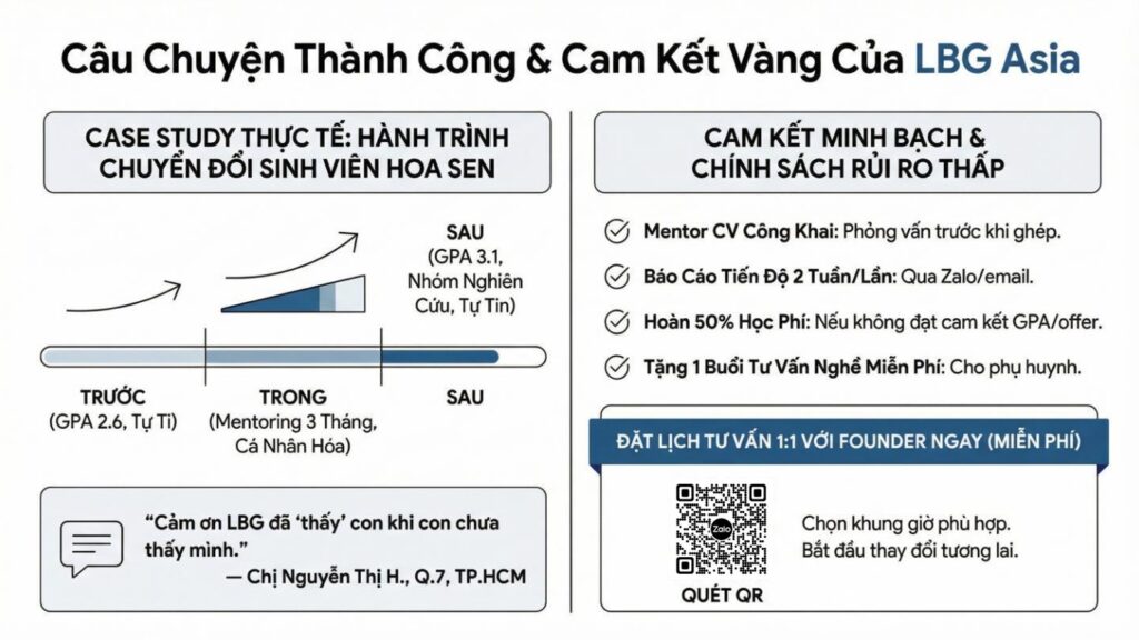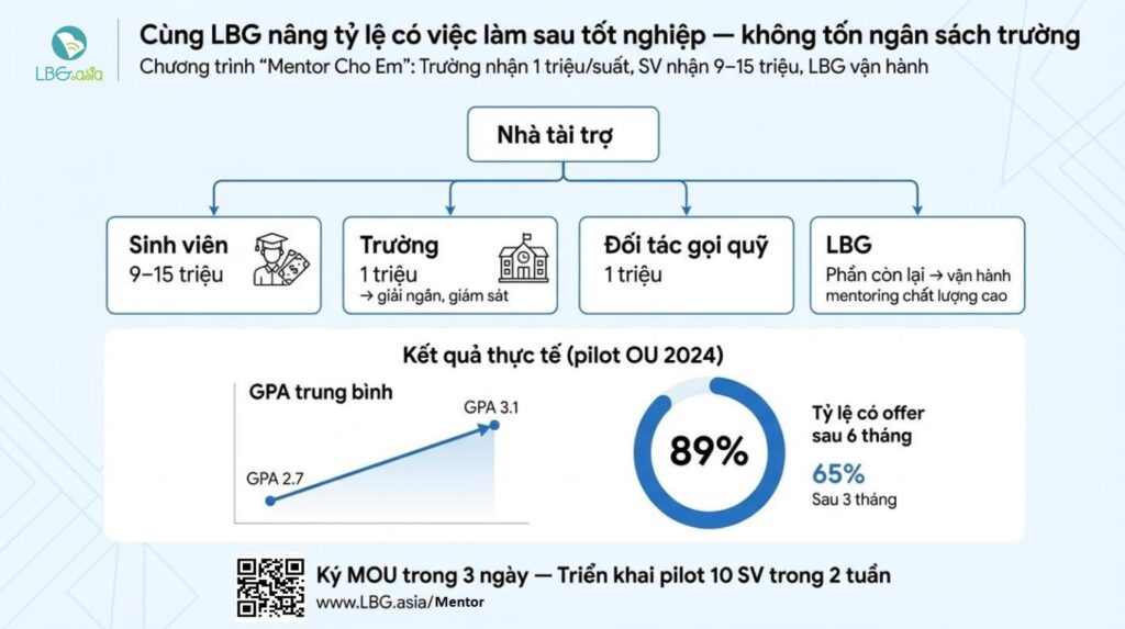 Chúng tôi đã sẵn sàng triển khai pilot trong 2 tuần — với cam kết: nếu SV không có offer sau 6 tháng, LBG sẽ hoàn lại 50% phần đóng góp cho LBG.