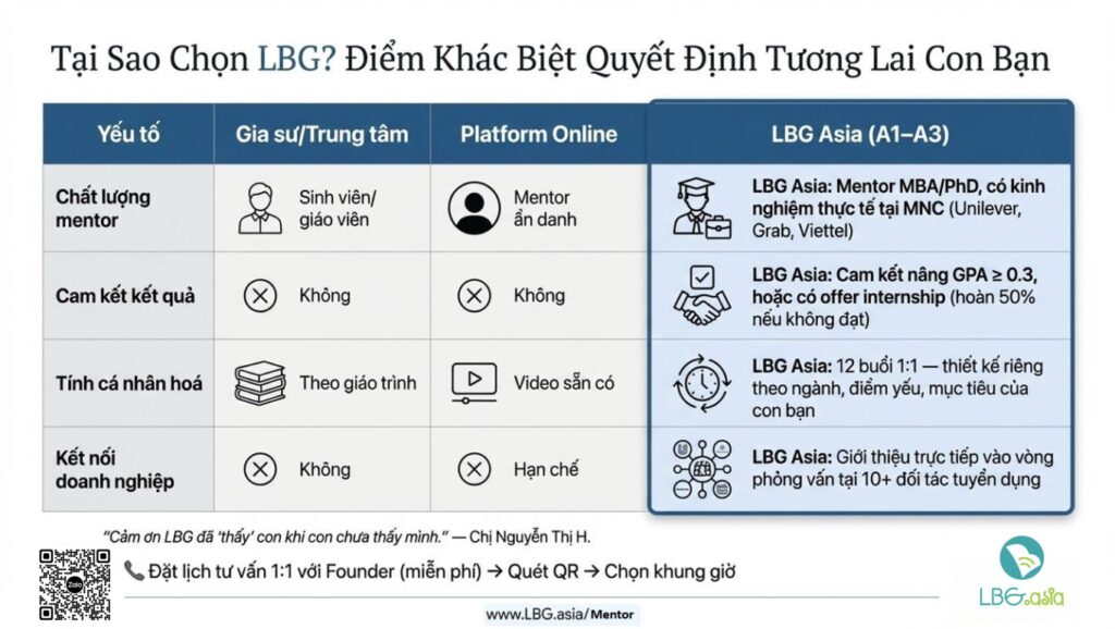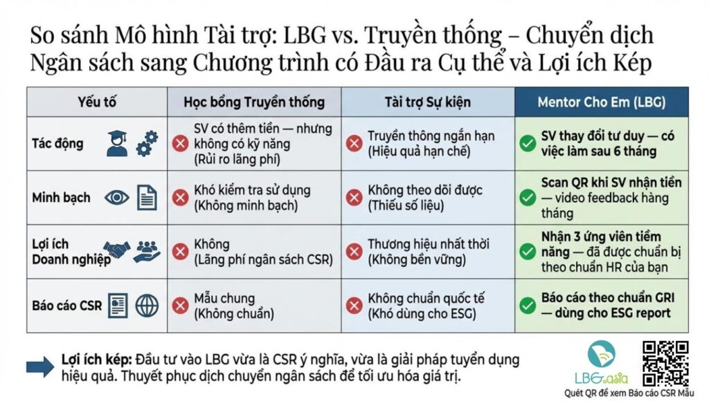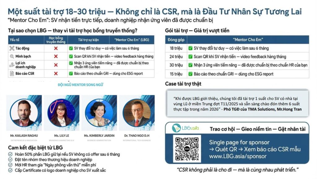 Thay vì chỉ trao học bổng như cách truyền thống, LBG xin phép đề xuất với Quý doanh nghiệp một gói trao học bổng tạo tác động xã hội với: mỗi suất 18–30 triệu/ sinh viên, cho một hành trình 3 tháng — nơi SV được mentor 1:3, học kỹ năng thực tập thực tế, và làm quen với môi trường chuyên nghiệp của doanh nghiệp.